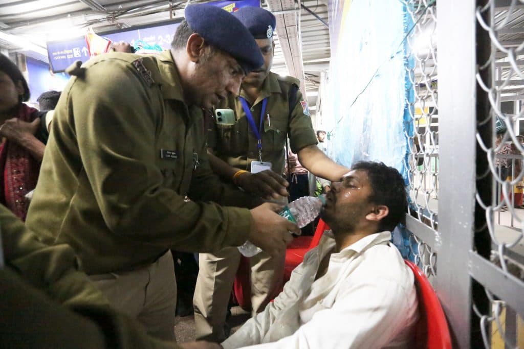 भारी भीड़ के कारण कई यात्रियों की तबीयत खराब हो जा रही है. ऐसे ही एक यात्री की देखभाल करती पुलिस