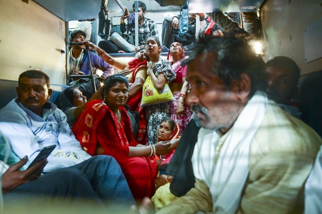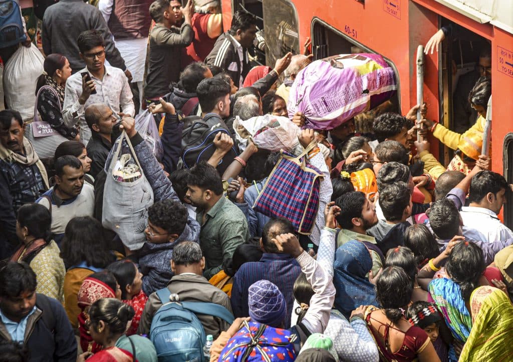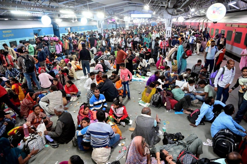प्लेटफॉर्म में हजारों यात्री ट्रेन की प्रतीक्षा में बैठे हैं. ट्रेन के आते ही भारी संख्या में भीड़ अंदर जाने के लिए दौड़ पड़ती है.