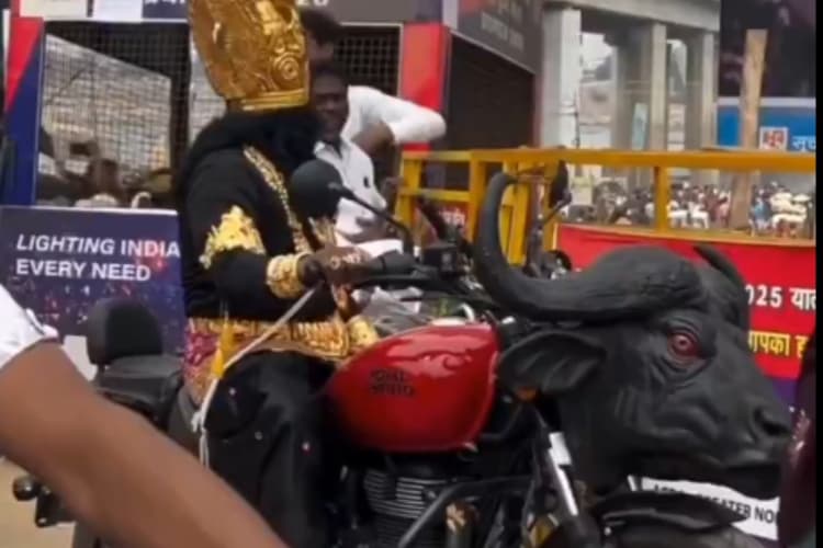 Man Seen In Yamraj Costume Viral Video: सोशल मीडिया पर कब आपको कुछ रोचक देखने को मिल जाए कोई नहीं जानता. हैरान करने वाली चीजें आपको दिनभर देखने को मिलती है. एक वीडियो ऐसा ही सोशल मीडिया पर खूब चर्चा में है. सड़क पर एक यमराज का वीडियो खूब वायरल हो रहा है. इस वीडियो में एक आदमी बाइक पर बैठ नजर आ रहा है. लेकिन यह आदमी कोई नॉर्मल कपड़ों में नहीं है और न ही उस बंदे की बाइक ही नॉर्मल है. उसके बाइक में भैस का सर लगा हुआ है. इतना ही नहीं वह लड़का खूब भी यमराज के ड्रेस में है.