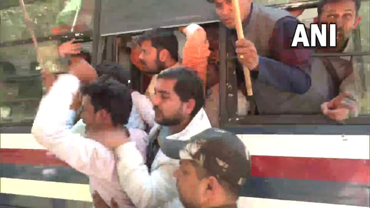 विरोध मार्च करते हुए बीजेपी समर्थक पुलिस बैरिकेड्स पर चढ़ गए