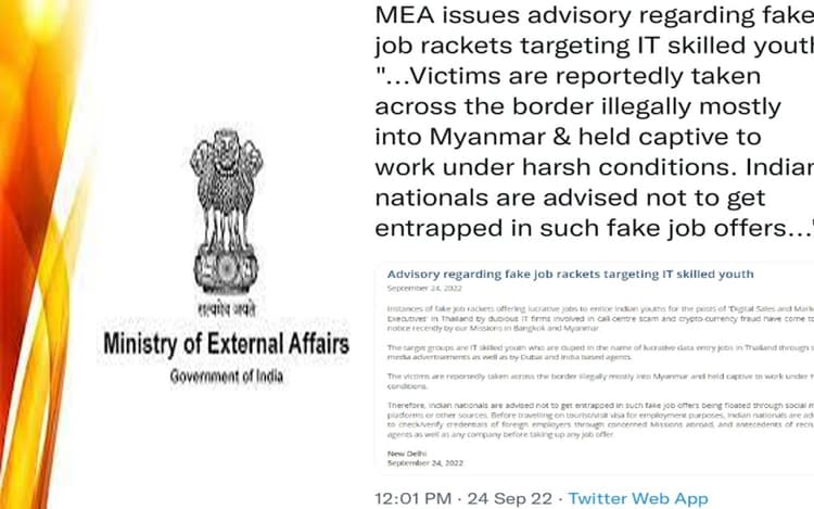 विदेश मंत्रालय ने आईटी कुशल युवाओं को निशाना बनाने वाले फर्जी जॉब रैकेट के संबंध में एडवाइजरी जारी की. एडवाइजरी में कहा गया है कि पीड़ितों को कथित तौर पर अवैध रूप से सीमा पार म्यांमार ले जाया जाता है और कठोर परिस्थितियों में काम करने के लिए बंदी बना लिया जाता है. एडवाइजरी में चेतावनी दी गई है कि भारतीय नागरिकों को सलाह दी जाती है कि वे इस तरह के फर्जी जॉब ऑफर्स के झांसे में आने से बचे.