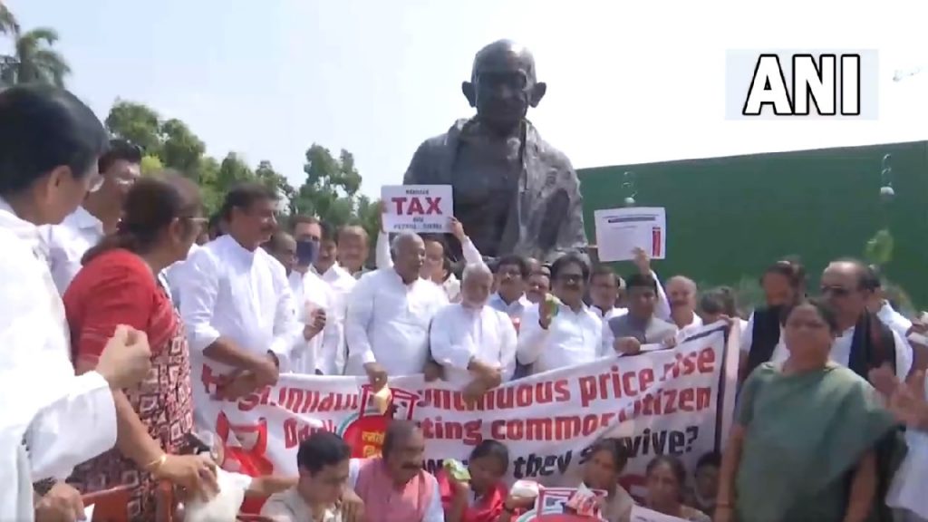 राहुल गांधी के नेतृत्व में कांग्रेस और कुछ अन्य विपक्षी दलों के सांसदों ने महंगाई और कई जरूरी खाद्य वस्तुओं को माल एवं सेवा कर (जीएसटी) के दायरे में लाए जाने के विरोध में बुधवार को संसद भवन परिसर में धरना दिया. इन सांसदों ने महात्मा गांधी की प्रतिमा के समक्ष धरना दिया. इन लोगों ने एक बैनर भी ले रखा था जिस पर गैस सिलेंडर की तस्वीर थी और लिखा था ‘‘दाम बढ़ने से आम नागरिकों का जीवन बुरी तरह प्रभावित हो रहा है, वे कैसे जीवन यापन करेंगे?