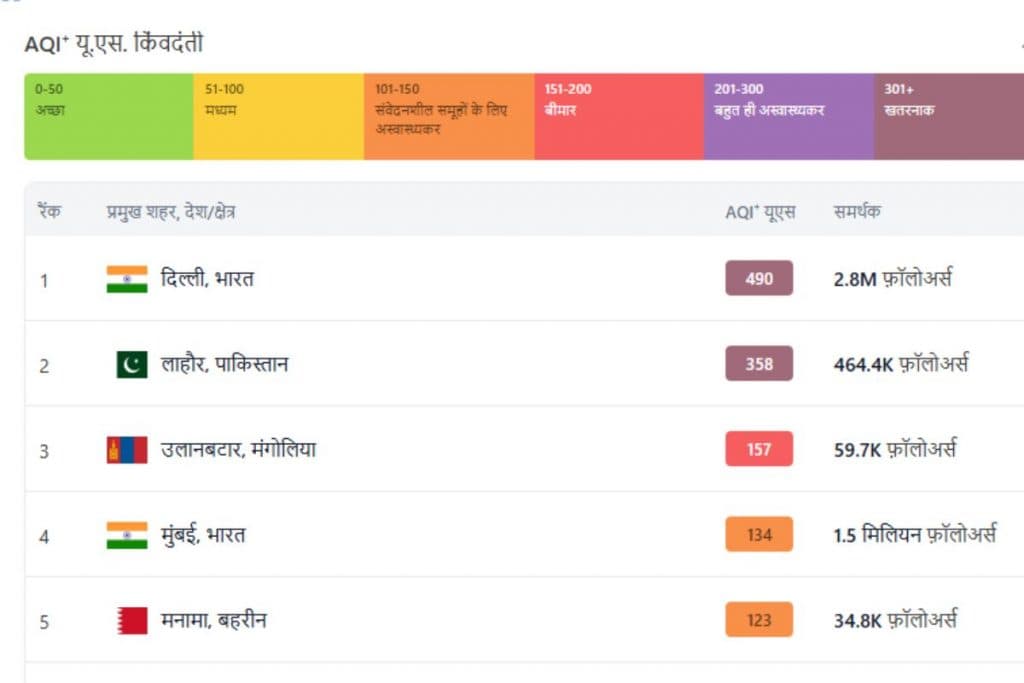 आईक्यूएयर ने जो लाइव सूची जारी की है उसमें दिल्ली वायु गुणवत्ता सूचकांक (एक्यूआई) 490 के साथ टॉप पर है. वहीं पाकिस्तान का लाहौर शहर दूसरे नंबर पर है. लाहौर में एक्यूआई 358 दर्ज किया गया है. जबकि मंगोलिया का उलानबटार तीसरा सबसे प्रदूषित शहर बन गया है. जिसमें एक्यूआई 157 दर्ज किया गया है.