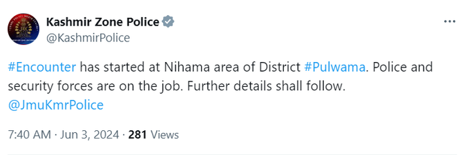 कश्मीर जोन पुलिस की ओर से जानकारी दी गई है कि पुलवामा जिले के निहामा इलाके में मुठभेड़ सोमवार सुबह शुरू हुई जो अभी जारी है. पुलिस और सुरक्षा बल ऑपरेशन में लगे हुए हैं.