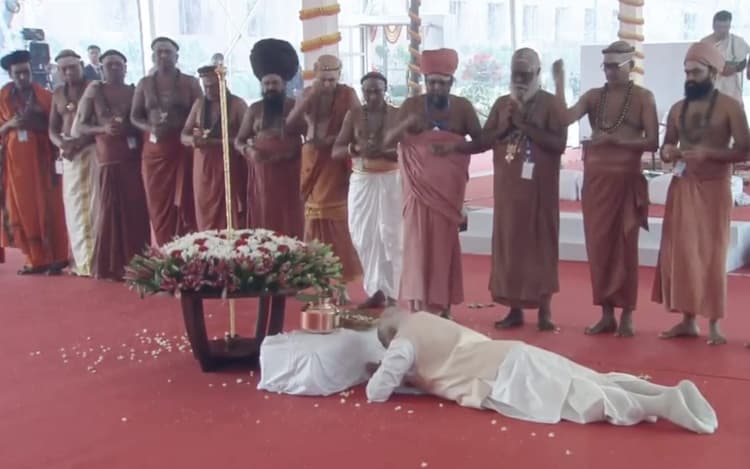प्रधानमंत्री नरेंद्र मोदी ने सेंगोल (राजदंड) को दंडवत प्रणाम किया और हाथ में पवित्र राजदंड लेकर तमिलनाडु के विभिन्न अधीनमों के पुजारियों का आशीर्वाद लिया.