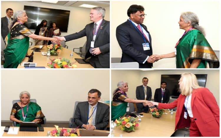 Nirmala Sitharaman: केंद्रीय वित्तमंत्री निर्मला सीतारमण ने बुधवार को महत्वपूर्ण आर्थिक मुद्दों पर केंद्रित विषयों पर वाशिंगटन में वैश्विक वित्त मंत्रियों और शीर्ष अंतरराष्ट्रीय संगठनों के प्रमुखों के साथ बैक-टू-बैक द्विपक्षीय बैठकें कीं. बता दें कि सीतारमण IMF और विश्व बैंक की वार्षिक बैठकों, G20 वित्त मंत्रियों और सेंट्रल बैंक गवर्नर (FMCBG) की बैठकों में भाग लेने के लिए संयुक्त राज्य अमेरिका की आधिकारिक यात्रा पर हैं. वित्त मंत्री दुनिया भर के कई देशों के साथ द्विपक्षीय बैठकें कर रही हैं. वह OECD, यूरोपीय आयोग और UNDP के नेताओं और प्रमुखों के साथ आमने-सामने की बैठकें भी कर रही हैं.