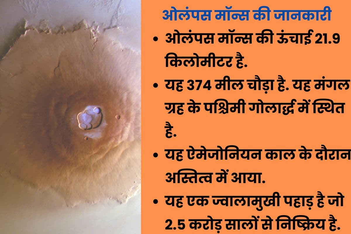 ओलंपस मॉन्स न सिर्फ हिमालय पर्वतमाला के माउंट एवरेस्ट से ऊंचा है. बल्कि, सोलर सिस्टम में अभी तक के खोजे गये किसी भी पहाड़ से इसकी ऊंचाई अधिक है. ऐसे में यह हमारे सौरमंडल का अभी तक का ज्ञात सबसे बड़ा पहाड़ है.
