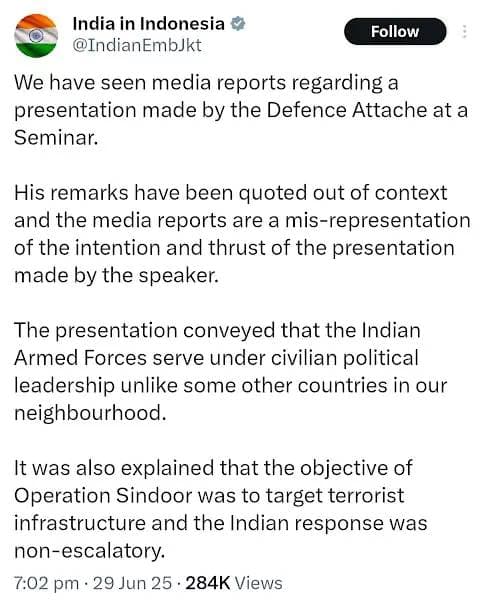 खबर का खंडन करते हुए कहा गया कि हमने सेमिनार में रक्षा प्रतिनिधि द्वारा दिए गए प्रजेंटेशन से जुड़ी मीडिया रिपोर्ट्स देखी हैं. उनके बयान को संदर्भ से हटकर पेश किया गया है. मीडिया रिपोर्ट्स में उनकी बातों की मंशा और मैसेज को गलत तरीके से दिखाया गया. इंडोनेशिया में भारतीय दूतावास ने एक बयान में कहा, “हमने सेमिनार में रक्षा प्रतिनिधि द्वारा दी गई प्रस्तुति से जुड़ी मीडिया रिपोर्ट्स देखी हैं. उनके बयान को संदर्भ से हटकर पेश किया गया है.”
