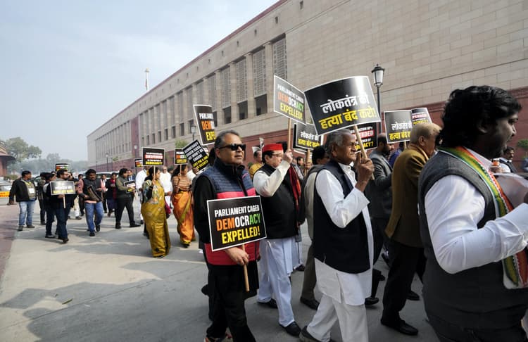 विपक्षी सांसदों ने दोनों सदनों से 140 सदस्यों के निलंबन पर विरोध जताते हुए गुरुवार को संसद भवन से एक मार्च निकाला जो विजय चौक पर संपन्न हुआ. राज्यसभा में नेता प्रतिपक्ष मल्लिकार्जुन खरगे की अगुवाई में विपक्षी सांसदों ने संसद भवन से विजय चौक तक पैदल मार्च किया. विपक्षी सांसदों ने एक बड़ा बैनर हाथों में ले रखा था जिस पर लिखा था ‘लोकतंत्र बचाओ’….मल्लिकार्जुन खरगे ने दावा किया कि प्रधानमंत्री नरेंद्र मोदी और गृह मंत्री अमित शाह संसद से जुड़े विषयों पर सदन के बाहर बोल रहे हैं जो विशेषाधिकार हनन का मामला बनता है.