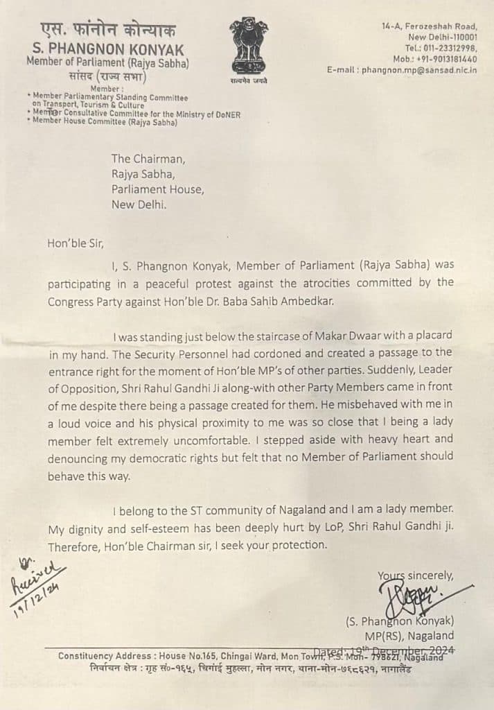 बीजेपी महिला सांसद एस फागनोन कोन्याक ने राज्यसभा के सभापति को पत्र लिखकर कांग्रेस सांसद और विपक्ष के नेता राहुल गांधी पर उनके साथ दुर्व्यवहार करने का आरोप लगाया. उन्होंने राज्यसभा के सभापति को लिखे पत्र में लिखा है, “विपक्ष के नेता राहुल गांधी ने मेरे सम्मान और स्वाभिमान को गहरी ठेस पहुंचाई है.”