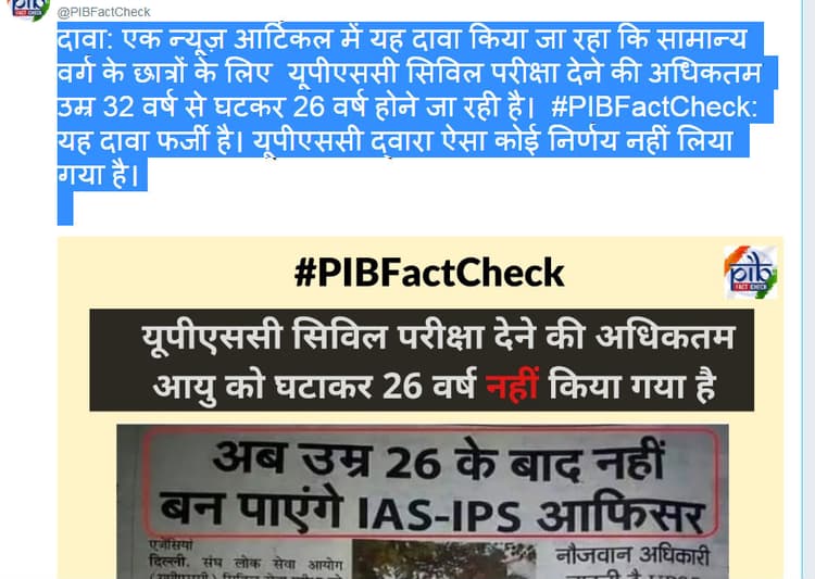 इस खबर की सच्चाई को पीआईबी ने फैक्ट चेक के जरिये बताया है. पीआईबी ने ट्वीट किया है – एक न्यूज़ आर्टिकल में यह दावा किया जा रहा कि सामान्य वर्ग के छात्रों के लिए यूपीएससी सिविल परीक्षा देने की अधिकतम उम्र 32 वर्ष से घटकर 26 वर्ष होने जा रही है. जबकि यह दावा फर्जी है. यूपीएससी द्वारा ऐसा कोई निर्णय नहीं लिया गया है.