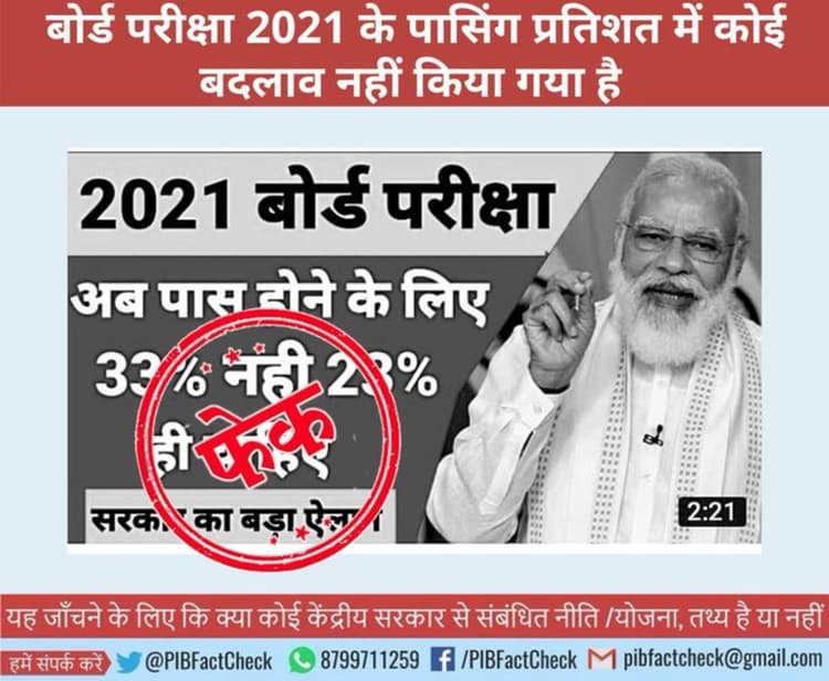 सरकारी एजेंसी प्रेस इन्फॉर्मेशन ब्यूरो की फैक्ट चेक टीम ने जब दावे की पड़ताल की तो यह पूरी तरह से फर्जी निकला. पीआईबी फैक्ट चेक के ट्विटर हैंडल पर बताया गया कि सोशल मीडिया पर एक मैसेज में दावा किया जा रहा है कि 10वीं और 12वीं की 2021 बोर्ड की परीक्षा में अब पास होने के लिए 33 प्रतिशत अंक को घटाकर 23 फीसदी कर दिया गया है. यह दावा फर्जी है. शिक्षा मंत्रालय की ओर से ऐसी कोई घोषणा नहीं की गयी है.