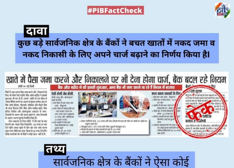 PIB Fact Check में यह बताया गया है -एक मीडिया रिपोर्ट ने दावा किया है कि कुछ बड़े सार्वजनिक क्षेत्र के बैंकों ने बचत खातों में नकद जमा व नकद निकासी के लिए अपने चार्ज बढ़ाने का निर्णय किया है. यह दावा गलत है. उक्त बैंकों ने बचत खातों में नकद जमा व नकद निकासी के चार्ज बढ़ाने का कोई निर्णय नहीं लिया है.