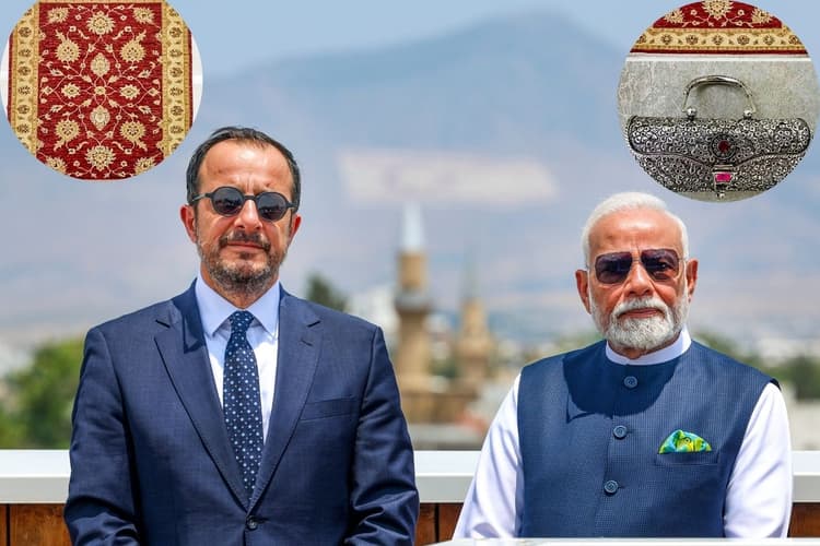 PM Modi Gifts: प्रधानमंत्री नरेंद्र मोदी ने साइप्रस की अपनी यात्रा के दौरान , साइप्रस के राष्ट्रपति निकोस क्रिस्टोडौलिडेस को एक उत्कृष्ट कश्मीरी रेशम कालीन और प्रथम महिला फिलिपा कारसेरा को आंध्र प्रदेश का एक चांदी का क्लच पर्स उपहार में दिया. लाल रंग के इस कालीन में पारंपरिक बेल और ज्यामितीय आकृतियां हैं. यह दो-रंग का बेहतरीन प्रभाव दिखाता है, जो देखने के कोण और प्रकाश के आधार पर रंग बदलता हुआ प्रतीत होता है – जिससे एक ही स्थान पर दो अलग-अलग कालीनों का भ्रम पैदा होता है. साइप्रस के राष्ट्रपति को उपहार स्वरूप दिया गया कालीन कश्मीरी कारीगरों के कौशल का अनूठा उदाहरण है.