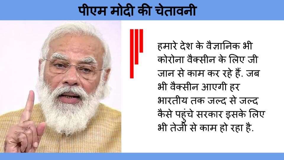 PM Modi Speech Today Highlight (Summary) In Hindi : कोरोना संकट झेलते हुए 250 दिन से ज्यादा हो चुके हैं. इस बीच सातवीं बार राष्ट्र के नाम संबोधन में पीएम मोदी ने देशवासियों को लापरवाही के लिए आगाह किया. उन्होंने इस संबोधन में सावधानियों की सात बातें की. देश के सामने कोरोना का आंकड़ा बताते हुए भी कहा कि भारत आज संभली स्थिति में है लेकिन थोड़ी सी लापरवाही पूरे परिवार, बुजुर्गों और बच्चों को खतरे में डाल सकती है.