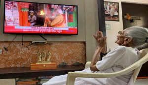 प्रधानमंत्री मोदी की मां हीराबेन को गांधीनगर स्थित अपने आवास पर टीवी के सामने कुर्सी पर बैठकर हाथ जोड़े हुए देखा जा सकता है. टीवी के स्क्रीन पर प्रधानमंत्री मोदी की मंदिर निर्माण के लिए आधारशिला रखने और भूमि पूजन करने वाली तस्वीर दिखाई दे रही है. वहीं, उनकी मां टीवी के सामने श्रद्धापूवर्क हाथ जोड़े पुरुषोत्तम श्रीराम को नमस्कार कर रही हैं.