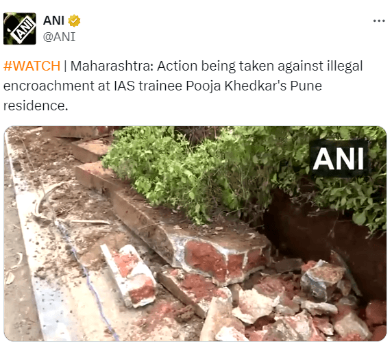 Pooja Khedkar: प्रशिक्षु आईएएस पूजा खेडकर के पुणे स्थित आवास पर अवैध अतिक्रमण को ढहा दिया गया है. प्रशासन ने उनके घर की चारदीवारी को तोड़ दिया है. पूजा खेडकर के ट्रेनिंग प्रोग्राम को भी रद्द कर दिया है.