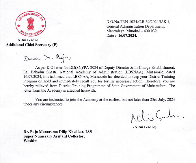 महाराष्ट्र कैडर की ट्रेनी आईएएस पूजा खेडकर का प्रशिक्षण कार्यक्रम को स्थगित कर दिया गया है. उन्हें 23 जुलाई तक लाल बहादुर शास्त्री राष्ट्रीय प्रशासन अकादमी में रिपोर्ट करने को कहा गया है. अकादमी ने आगे की आवश्यक कार्रवाई के लिए उन्हें वापस बुलाने का फैसला किया है. महाराष्ट्र के अतिरिक्त मुख्य सचिव नितिन गदरे की ओर से लिखे गए पत्र में कहा गया है कि अकादमी ने खेडकर के जिला प्रशिक्षण कार्यक्रम को स्थगित करने का फैसला किया है. साथ ही आगे की जरूरी कार्रवाई के लिए उन्हें तत्काल वापस बुला लिया है.