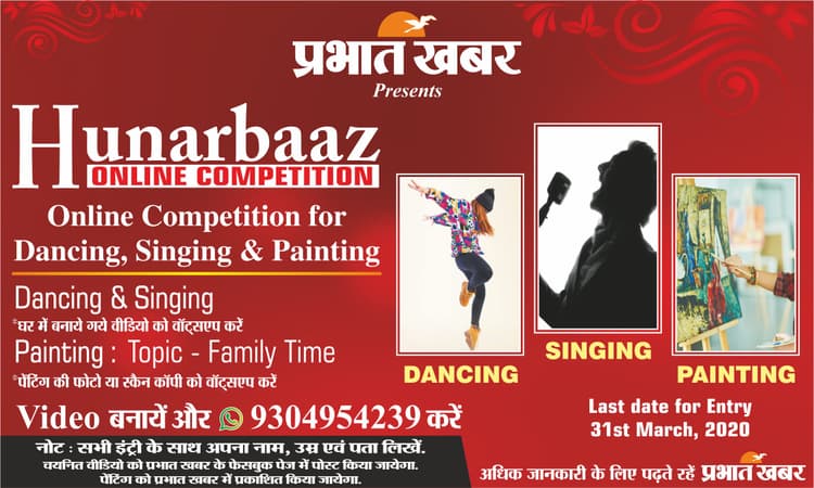 प्रविष्टियां भेजने की अंतिम तिथि 31 मार्च 2020 है. शीर्ष 5 पेंटिंग अखबार में प्रकाशित की जाएगी और शीर्ष 5 नृत्य और गीत प्रभात खबर के फेसबुक पेज पर दिखाये जायेंगे. (दोनों जूनियर और सीनियर वर्ग में)