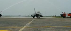 फ्रांस से अंबाला एयरबेस पहुंचे सभी 5 राफेल फाइटर जेट्स को सलामी दी गयी.