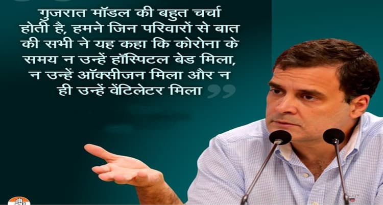 राहुल गांधी का आरोप है कि गुजरात में कोरोना वायरस के संक्रमण से तीन लाख लोगों की जान गयी है जबकि सरकार सिर्फ 10 हजार लोगों को मुआवजा दे रही है जो पीड़ित परिवारों के प्रति अन्याय है.