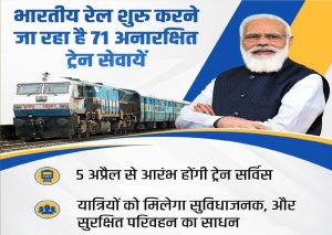 भारतीय रेल यात्री सुविधाओं में बढोत्तरी करते हुए 5 अप्रैल से, 71 अनारक्षित ट्रेन सेवायें आरंभ करने जा रहा है।