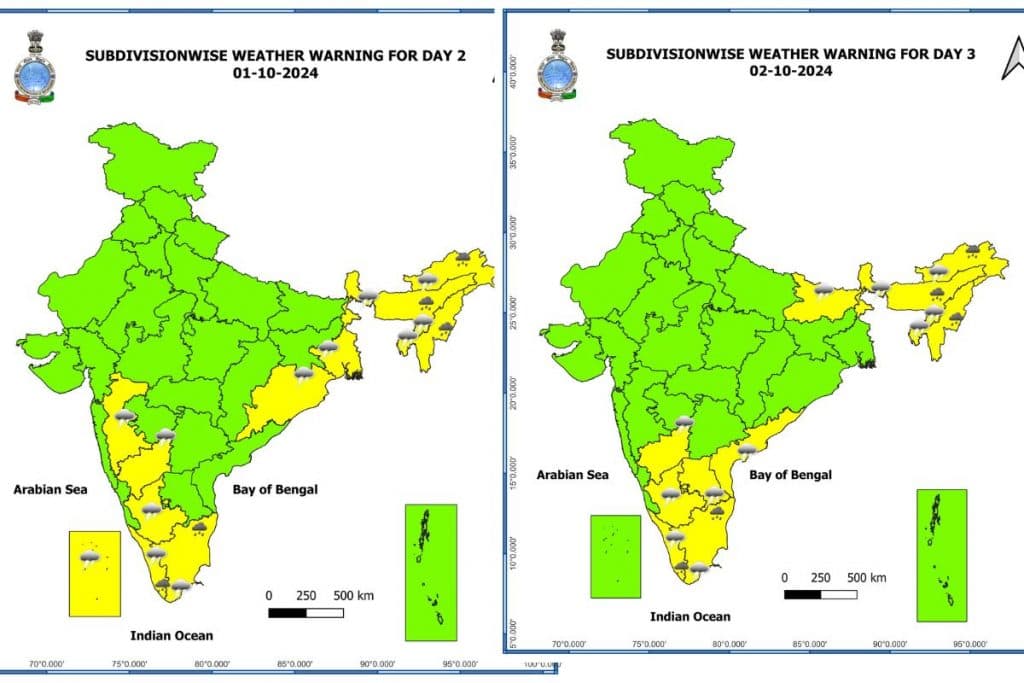 मौसम विभाग के अनुसार दो अक्टूबर को बिहार, आंध्र प्रदेश, तमिलनाडु, केरल, कर्नाटक, असम, अरुणाचल प्रदेश, मेघालय, मिजोरम, मणिपुर, त्रिपुरा, नगालैंड और सिक्किम में भारी बारिश की संभावना है.