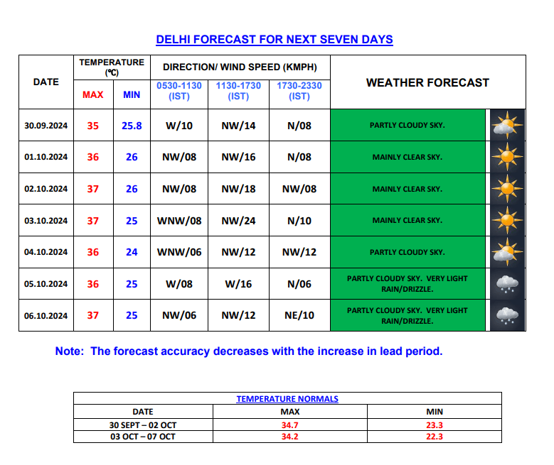 Rain Alert in Navratri 2024 : दिल्ली में सोमवार को न्यूनतम तापमान सामान्य से 2.5 डिग्री अधिक 25.8 डिग्री सेल्सियस रिकॉर्ड किया गया. मौसम विभाग (आईएमडी) ने कहा कि दिन में आंशिक रूप से बादल छाए रहेंगे और अधिकतम तापमान 35 डिग्री सेल्सियस के आसपास रह सकता है. मंगलवार से राजधानी में धूप खिली रहेगी. इसके बाद 5 अक्टूबर से बारिश फिर देखने को मिल सकती है. जानें देश के अन्य राज्यों के मौसम का हाल..