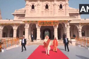 प्रधानमंत्री नरेंद्र मोदी मंगलवार सुबह अयोध्या पहुंचे. साकेत महाविद्यालय पर उनका हेलीकॉप्टर उतरा. वहां से काफिले संग टेढ़ी बाजार होते हुए उन्होंने श्रीराम मंदिर परिसर में प्रवेश किया. इस दौरान अयोध्यावासियों ने जयश्रीराम, जय जय हनुमान के गगनभेदी नारों संग उनका स्वागत किया. अयोध्यावासी एक हाथ में भगवा ध्वज तो दूसरे हाथ में तिरंगा फहराते हुए प्रधानमंत्री का स्वागत करते रहे. प्रधानमंत्री ने भी पूरे रास्ते में हाथ हिलाकर अयोध्यावासियों का अभिवादन किया.