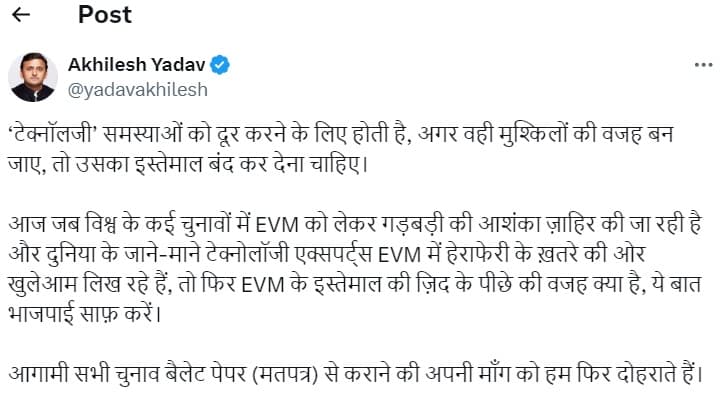 सपा प्रमुख अखिलेश यादव ने ईवीएम पर सवाल उठाते हुए एक्स पर पोस्ट डाला. जिसमें उन्होंने लिखा, ‘टेक्नॉलजी’ समस्याओं को दूर करने के लिए होती है, अगर वही मुश्किलों की वजह बन जाए, तो उसका इस्तेमाल बंद कर देना चाहिए. आज जब विश्व के कई चुनावों में EVM को लेकर गड़बड़ी की आशंका जाहिर की जा रही है और दुनिया के जाने-माने टेक्नोलॉजी एक्सपर्ट्स EVM में हेराफेरी के खतरे की ओर खुलेआम लिख रहे हैं, तो फिर EVM के इस्तेमाल की जिद के पीछे की वजह क्या है, ये बात भाजपाई साफ करें. आगामी सभी चुनाव बैलेट पेपर (मतपत्र) से कराने की अपनी मांग को हम फिर दोहराते हैं.