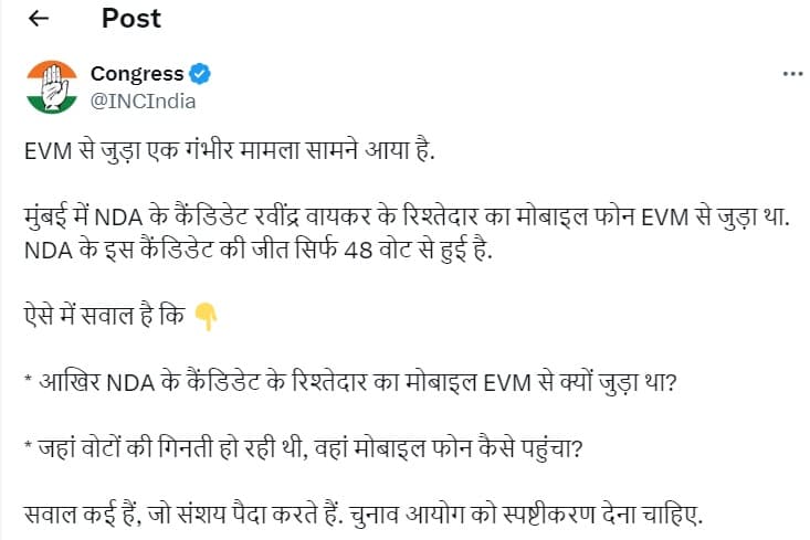 कांग्रेस ने ईवीएम मामले को लेकर एक्स पर लंबा पोस्ट डाला, जिसमें कई सवाल पूछे. कांग्रेस ने अपने पोस्ट में लिखा, EVM से जुड़ा एक गंभीर मामला सामने आया है. मुंबई में NDA के कैंडिडेट रवींद्र वायकर के रिश्तेदार का मोबाइल फोन EVM से जुड़ा था. NDA के इस कैंडिडेट की जीत सिर्फ 48 वोट से हुई है. ऐसे में सवाल है कि आखिर NDA के कैंडिडेट के रिश्तेदार का मोबाइल EVM से क्यों जुड़ा था? जहां वोटों की गिनती हो रही थी, वहां मोबाइल फोन कैसे पहुंचा? सवाल कई हैं, जो संशय पैदा करते हैं. चुनाव आयोग को स्पष्टीकरण देना चाहिए.