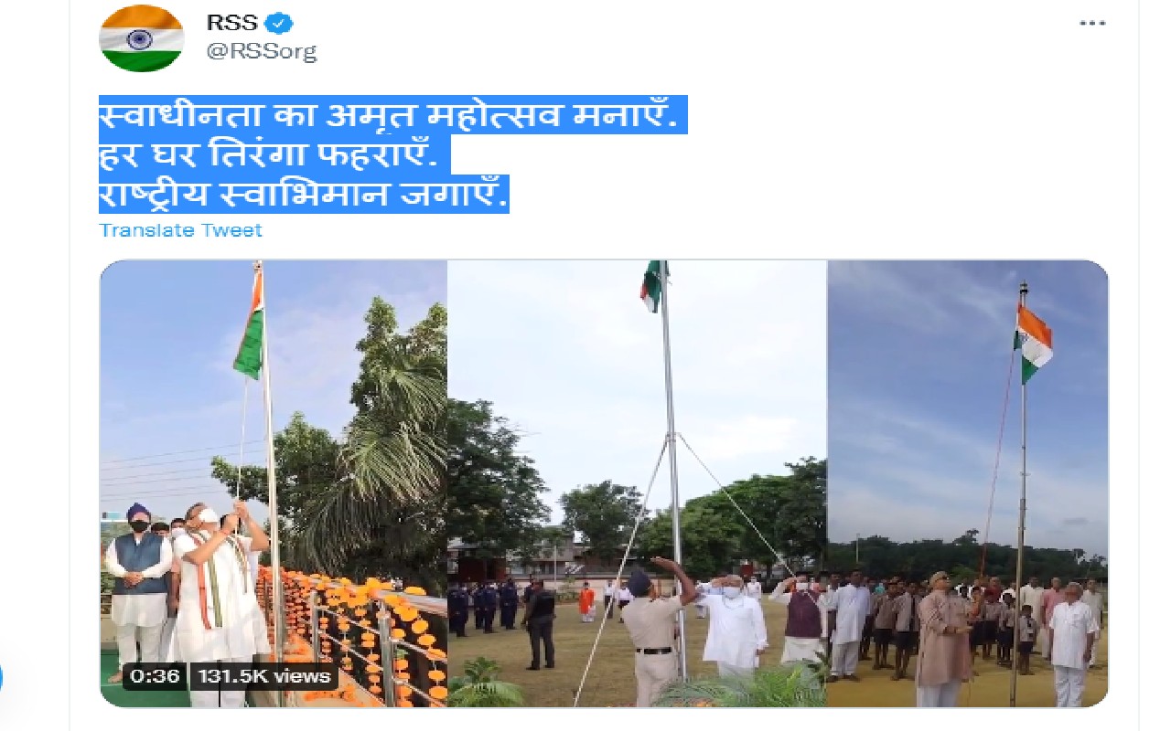 वीडियो को शेयर करते हुए संघ के ट्विटर वॉल पर लिखा गया कि स्वाधीनता का अमृत महोत्सव मनाएं…हर घर तिरंगा फहराएं…राष्ट्रीय स्वाभिमान जगाएं… यहां चर्चा कर दें कि इससे पहले संघ ने अपने आधिकारिक ट्वीटर हैंडल में तिरंगा की डीपी लगाई थी जिसकी चर्चा पूरे देश में हो रही है. ऐसा करके संघ की ओर से विपक्ष को करारा जवाब दिया गया है. गौर हो कि यह स्वतंत्रता दिवस के एक दिन पहले किया गया है.