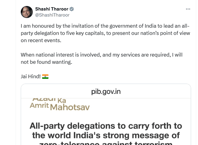 Shashi Tharoor : कांग्रेस के वरिष्ठ नेता शशि थरूर ने विदेश जाने वाले सात प्रतिनिधिमंडलों में से एक का नेतृत्व करने की जिम्मेदारी मिलने के बाद रिएक्शन दिया है. उन्होंने कहा है कि जब राष्ट्रीय हित की बात होगी तो वह सेवा के लिए हमेशा उपलब्ध रहेंगे. लोकसभा सदस्य थरूर ने सोशल मीडिया प्लेटफार्म ‘एक्स’ पर लिखा, “हाल की घटनाओं पर हमारे देश का दृष्टिकोण प्रस्तुत करने के लिए पांच प्रमुख राजधानियों में एक सर्वदलीय प्रतिनिधिमंडल का नेतृत्व करने के लिए भारत सरकार के निमंत्रण से मैं सम्मानित महसूस कर रहा हूं.’’ उन्होंने कहा, “जब राष्ट्रीय हित की बात हो और मेरी सेवाओं की आवश्यकता हो तो मैं उपलब्ध रहूंगा. जय हिंद.”
