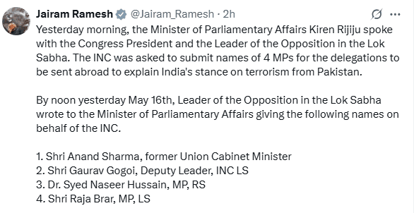 कांग्रेस नेता जयराम रमेश ने सोशल मीडिया प्लेटफार्म एक्स पर लिखा–संसदीय कार्य मंत्री किरेन रिजिजू ने कांग्रेस अध्यक्ष और लोकसभा में विपक्ष के नेता से बात की. कांग्रेस से पाकिस्तान से आतंकवाद पर भारत के रुख को स्पष्ट करने के लिए विदेश भेजे जाने वाले प्रतिनिधिमंडलों के लिए 4 सांसदों के नाम प्रस्तुत करने को कहा गया. 16 मई को दोपहर तक लोकसभा में विपक्ष के नेता ने संसदीय कार्य मंत्री को कांग्रेस की ओर से निम्नलिखित नाम देते हुए पत्र लिखा.