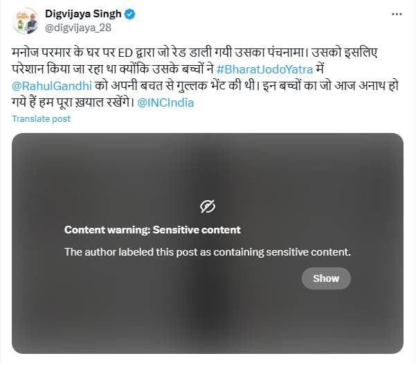 कांग्रेस के वरिष्ठ नेता और मध्य प्रदेश के पूर्व मुख्यमंत्री दिग्विजय सिंह ने एक्स पर रिएक्शन दिया है. उन्होंने लिखा, ”मनोज परमार के बच्चों ने भारत जोड़ो यात्रा के दौरान राहुल जी को गुल्लक भेंट की थी. मनोज के घर पर ईडी ने छापा मारा.. मनोज के अनुसार, उन पर छापा इसलिए मारा गया, क्योंकि वे कांग्रेस समर्थक हैं. मैंने मनोज के लिए वकील की भी व्यवस्था कर दी थी, लेकिन मुझे बड़े दुख के साथ कहना पड़ रहा है कि मनोज इतना डर गया था कि उसने और उसकी पत्नी ने आत्महत्या कर ली.