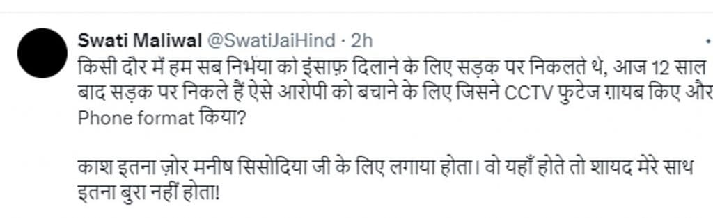 रविवार को स्वाति मालीवाल ने ‘एक्स’ पर लिखा कि किसी दौर में हम सब निर्भया को इंसाफ़ दिलाने के लिए सड़क पर निकलते थे. आज 12 साल बाद सड़क पर निकले हैं ऐसे आरोपी को बचाने के लिए जिसने सीसीटीवी फुटेज को गायब करने का काम किया और फोन को फॉर्मेट कर दिया. Phone format किया? आगे उन्होंने लिखा कि काश इतना जोर मनीष सिसोदिया जी के लिए लगाया होता. यदि वो यहां होते तो शायद मेरे साथ इतना बुरा नहीं होता!