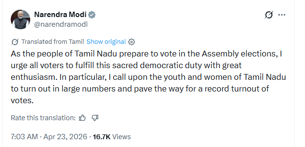 पीएम मोदी ने एक्स पर लिखा कि तमिलनाडु में विधानसभा चुनाव के लिए लोग तैयार हैं, ऐसे में सभी मतदाताओं से अपील है कि वे अपने इस अहम लोकतांत्रिक अधिकार का पूरे उत्साह के साथ इस्तेमाल करें. खासकर युवाओं और महिलाओं से पीएम ने कहा कि वे बड़ी संख्या में वोट डालने निकलें और इस बार रिकॉर्ड मतदान करने में अपनी अहम भूमिका निभाएं.