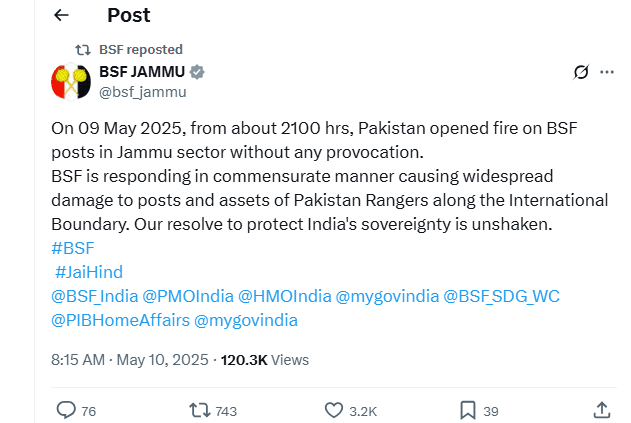 इस बीच बीएसएफ जम्मू ने अपने सोशल मीडिया प्लेटफार्म एक्स पर लिखा– 9 मई 2025 को पाकिस्तान ने बिना किसी उकसावे के जम्मू सेक्टर में बीएसएफ चौकियों पर गोलीबारी की. बीएसएफ ने भी उसी तरह जवाब दिया है, जिससे अंतरराष्ट्रीय सीमा पर पाकिस्तानी रेंजर्स की चौकियों और संपत्तियों को व्यापक नुकसान पहुंचा है. भारत की संप्रभुता की रक्षा के लिए हमारा संकल्प अडिग है.