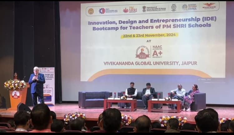 Bootcamp At Vivekananda Global University: विवेकानंद ग्लोबल यूनिवर्सिटी में इनोवेशन, डिजाइन और एंटरप्रेन्योरशिप (आईडीई) का दो दिवसीय बूट कैंप कार्यक्रम आयोजित किया गया. कार्यक्रम में राजस्थान के दो सौ पीएम श्री स्कूलों के शिक्षकों ने हिस्सा लिया. राजस्थान स्टेट प्रोजेक्ट के प्रमुख सुरेश कुमार बुनकर ने स्कूल शिक्षकों को उद्यमिता की ओर ले जाने और कौशल विकास पर जोर दिया. कार्यक्रम के उद्घाटन सत्र में विश्वविद्यालय के प्रेसिडेंट प्रो. एनडी माथुर ने कहा कि कार्यक्रम में शिक्षकों को डिजाइन थिंकिंग, बिजनेस मॉडलिंग और एंटरप्राइज प्लानिंग जैसे विषयों पर विस्तार से प्रशिक्षण दिया जाएगा. उन्होंने विश्वविद्यालय में इस कार्यक्रम को आयोजित कराने पर भी अपनी प्रशंसा की.