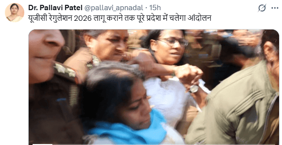 पल्लवी पटेल ने एक्स पर एक वीडियो शेयर किया है. वीडियो शेयर करते हुए उन्होंने लिखा कि यूजीसी रेगुलेशन 2026 लागू कराने तक पूरे प्रदेश में चलेगा आंदोलन. वीडियो में नजर आ रहा है कि पुलिस उन्हें उठाकर गाड़ी में डाल रही है. उनके समर्थक इसका विरोध कर रहे हैं. एक अन्य वीडियो विरोध मार्च का उन्होंने शेयर किया.