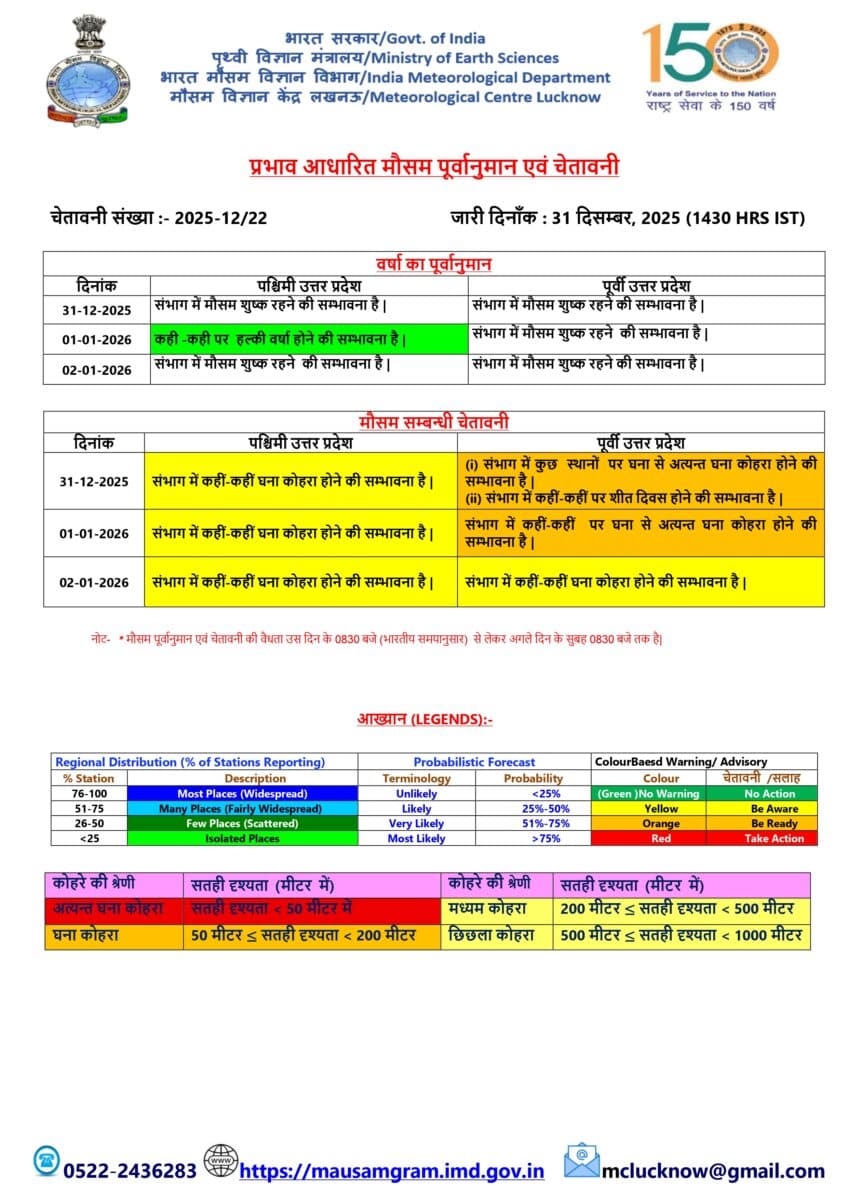 UP Weather : उत्तर प्रदेश में इन दिनों गलन वाली ठंड पड़ रही है. इस वजह से लोगों की परेशानी बढ़ गई है. सर्द हवाओं के साथ घना कोहरा भी लोगों की परेशानी की वजह बन रहा है. मौसम विभाग के अनुसार नए साल के पहले दिन यानी 1 जनवरी को प्रदेश के कुछ इलाकों में बारिश के आसार हैं. आज भी ठंड का असर बना रहेगा.