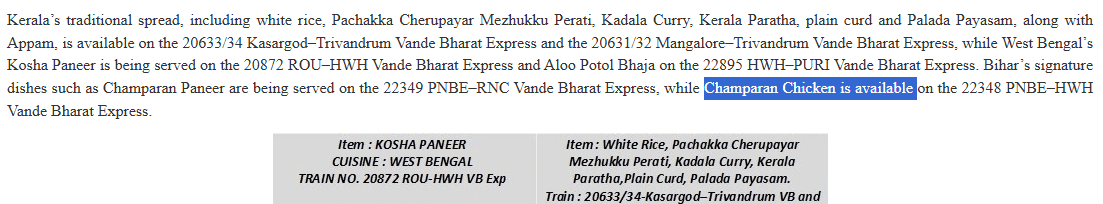 केरल के पारंपरिक भोजन में सफेद चावल, पचक्का चेरुपयार मेझुक्कू पेराटी, कडाला करी, केरल पराठा, सादा दही, पालाडा पायसम और अप्पम शामिल हैं. यह भोजन कासरगोड-तिरुवनंतपुरम और मंगलुरु-तिरुवनंतपुरम वंदे भारत एक्सप्रेस में मिल रहा है. पश्चिम बंगाल की कोषा पनीर और आलू पोटोल भाजा कुछ वंदे भारत ट्रेनों में परोसी जा रही है. वहीं, बिहार के खास व्यंजन चंपारण पनीर और चंपारण चिकन भी चुनिंदा वंदे भारत एक्सप्रेस ट्रेनों (22348 PNBE–HWH Vande Bharat Express) में यात्रियों को उपलब्ध कराए जा रहे हैं.