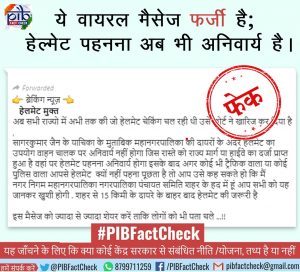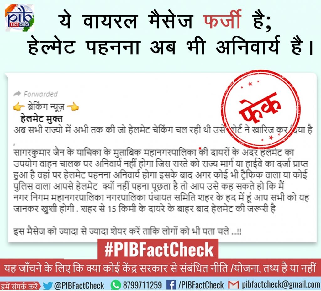 दावा : व्हाट्सप्प पर वायरल एक मैसेज में यह दावा किया जा रहा है की शहर से 15 किलोमीटर के दायरे के अंदर वाहन चालकों को अब हेलमेट पहनना अनिवार्य नहीं है#PIBFactCheck : यह दावा फर्जी है! वाहन चालकों को अभी भी हेलमेट पहनना अनिवार्य है l pic.twitter.com/rFQBnV7zDM