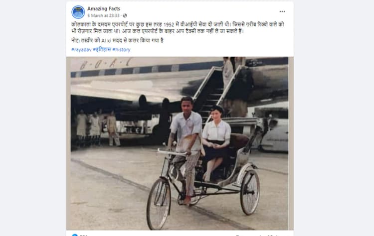 जो तस्वीर वायरल हो रही है वो कोलकाता के दमदम एयरपोर्ट की है. इसके कैप्शन में लिखा गया है कि कोलकाता के दमदम एयरपोर्ट पर कुछ इस तरह 1952 में वीआईपी सेवा देने का काम किया जाता था. इससे गरीब रिक्शे वाले को भी रोजगार मिल जाता था. वर्तमान समय में एयरपोर्ट के बाहर आप टैक्सी तक नहीं ले जा सकते हैं. इसके नोट में लिखा गया है कि तस्वीर को AI ki मदद से कलर किया गया है.