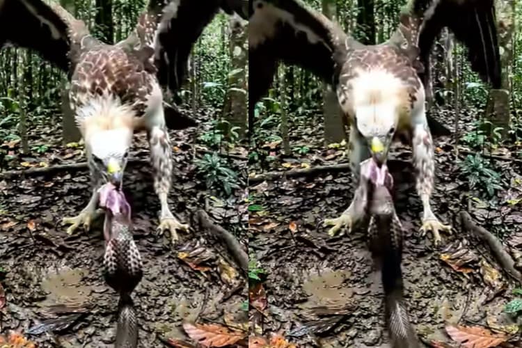 वीडियो में दिख रहा है कि बाज अपने चोंच पर एक मांस के टूकड़े को दबाए हुए है, उसी समय कोबरा भी वहां पहुंचता है और उसे बाज से छीनने की कोशिश करता है. बाज एक बार मांस के टूकड़े को अपने कब्जे में कर लेता है, लेकिन कोबरा बाज पर वापस हमला करता है और भोजन को छीनने की पूरी कोशिश करता है. कोबरा अपने मुंह में मांस के टूकड़े को कस कर पकड़ लेता है. बाज और कोबरा के बीच जंग काफी देर चलता रहता है.