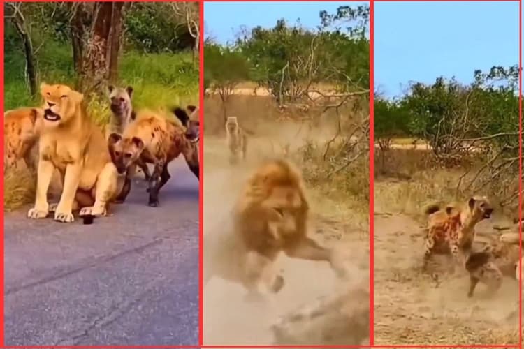 शेर ने लकड़बग्घों से शेरनी को बचाया
