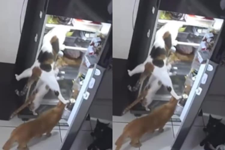 वीडियो में नजर आता है कि फ्रिज के पास बिल्लियों का झुंड खड़ा है. एक बिल्ली पैरों की मदद से फ्रिज का दरवाजा खोलती है, वहीं अन्य दो बिल्लियां फ्रिज के अंदर से खाना निकालने लगती हैं. इसके अलावा दो बिल्लियां फ्रिज से थोड़ी दूर बैठकर चारों ओर नज़र रखती रहती हैं. उन्हें देखकर ऐसा लगता है कि मानो वे पहरा दे रही हों.