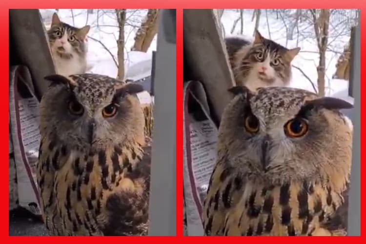 उल्लू को देख फटी रह गई बिल्ली की आंखें