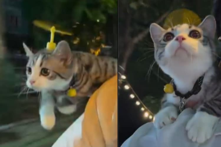 सोशल मीडिया पर एक वीडियो वायरल हो रहा है. इसमें एक बिल्ली को डोरेमोन की तरह है बेमबुकॉप्टर सिर पर पहने देखा जा सकता है. सोशल मीडिया पर वायरल हो रहे इस वीडियो में देखा जा सकता है कि एक व्यक्ति स्कूटी चलाते हुए जा रहा है. उसके पीछे वाले सीट पर एक बिल्ली बैठी हुई है. बिल्ली ने गले में डोरेमोन की तरह एक गोल्डन घंटी पहन रखी है और सिर पर गोल-गोल घूमने वाला बेमबुकॉप्टर पहना है. वह बार-बार कूदकर व्यक्ति के सामने आने की कोशिश करती है. एक पल तो ऐसा आता है जब लगता है कि वह बेमबुकॉप्टर की मदद से हवा में उड़ रही है. सोशल मीडिया पर इस बिल्ली ने लोगों के दिलों को जीत लिया है. सोशल मीडिया यूजर्स ने इस वीडियो पर अलग-अलग प्रतिक्रियाएं दी हैं.