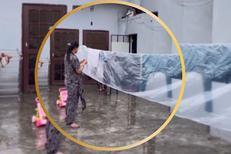 सोशल मीडिया पर जो वीडियो वायरल हो रहा है उसमें दिख रहा है कि एक महिला छत पर कपड़े फैलाकर उसके ऊपर प्लास्टिक रख दी है. यह देसी जुगाड़ सोशल मीडिया पर तेजी से वायरल हो रहा है. वीडियो क्लिप में दिख रहा है कि महिला रस्सी में कपड़े डालकर उसके ऊपर प्लास्टिक से कवर कर दे रही है. इस देसी जुगाड़ से अगर बारिश आ भी जाए तो कपड़े बारिश के पानी से गिले नहीं होंगे.